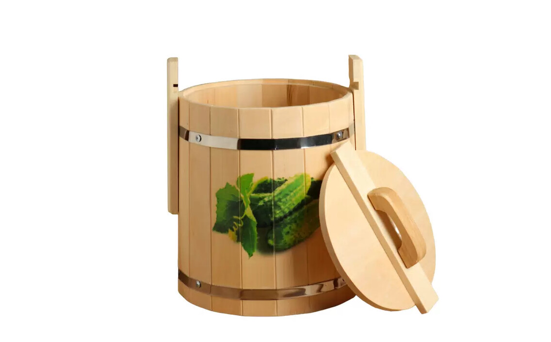 Кадка Добропаровъ из липы, 10л,нержавеющий обруч,с крышкой,с УФ-печатью "Огурчики" 5421789Сер. номер: 5421789