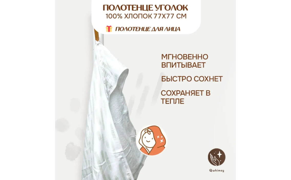 Полотенца Qwhimsy Полотенце детское махровое с уголком+полотенце муслиновое для лица, размер уголка 77х77 смСер. номер: 1734627669064546181