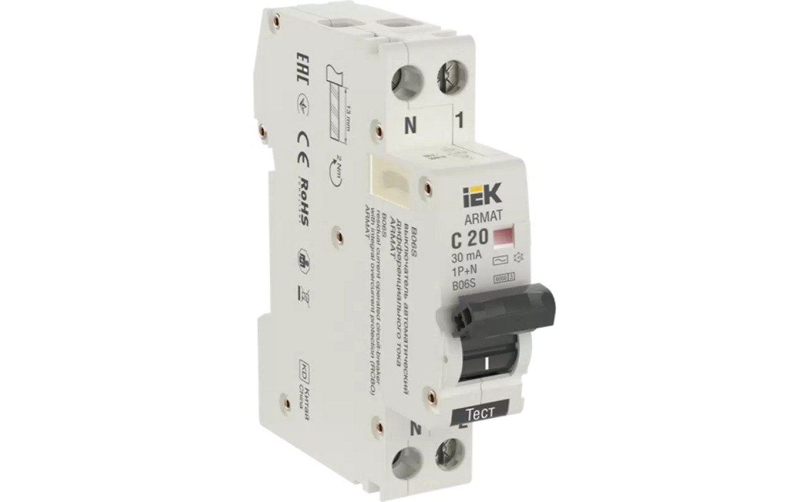 Выключатель автоматический дифференциального тока IEK ARMAT АВДТ B06S 1P+NP C20 30мА тип AСер. номер: AR-B06S-1N-C20A030