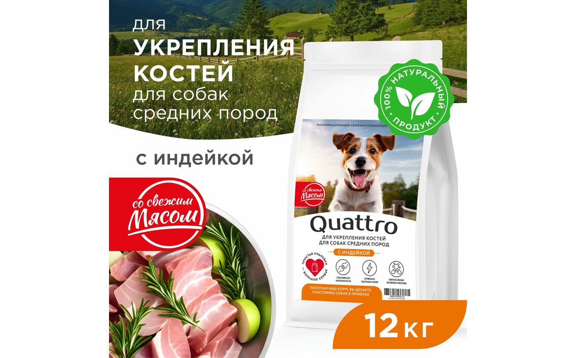 Сухой корм для собак QUATTRO, средние породы, укрепление костей, с индейкой, 12 кгСер. номер: 04687204706844