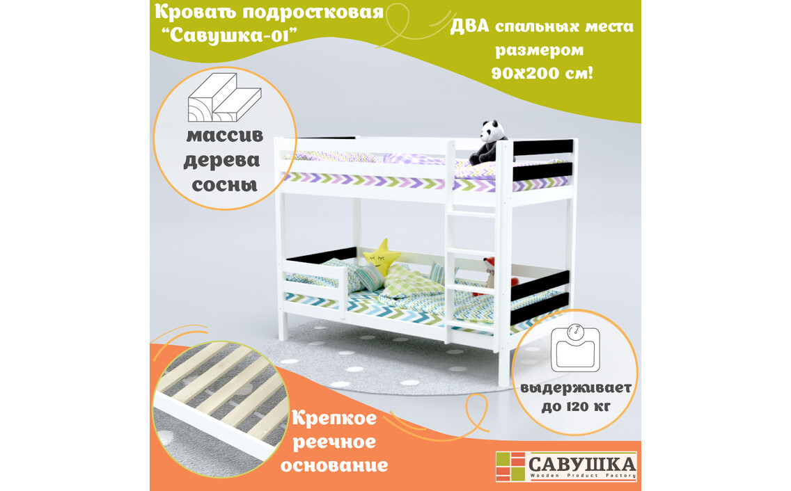 Кровать детская Савушка двухъярусная деревянная 90х200 Белая, Черная основание в комплектеСер. номер: КС-01-2Я-Ч