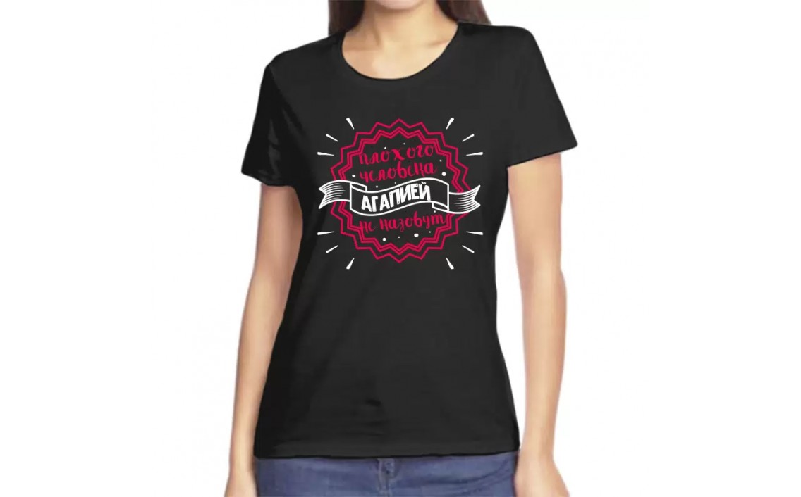 Футболка женская черная 58 р-р плохого человека агапией не назовутСер. номер: fzhch_plohogo_cheloveka_agapiey_nenazovut_kopich58