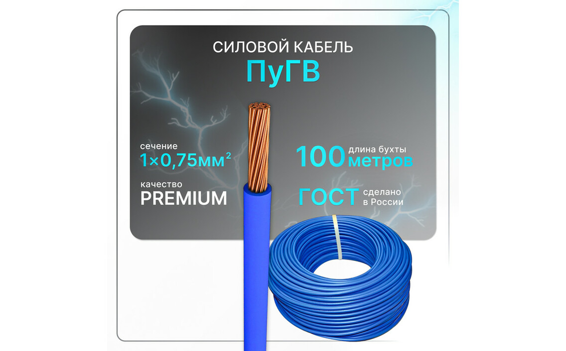 Силовой кабель ПуГВ 1х0.75 синий (100)ГОСТ ок, круглый, 100 мСер. номер: PuGV-1-075-100-B
