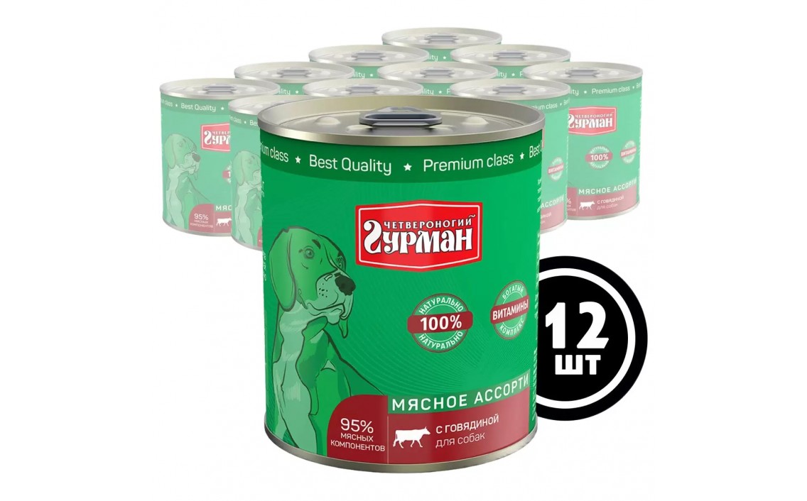 Консервы для собак Четвероногий гурман Мясное ассорти с говядиной, 12 шт по 340 гСер. номер: 100043947991