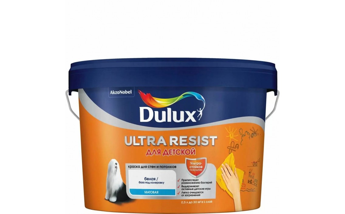 Краска для стен и потолков Dulux Ultra Resist, для детской, матовая, база BW, 2,5 лСер. номер: 5239223