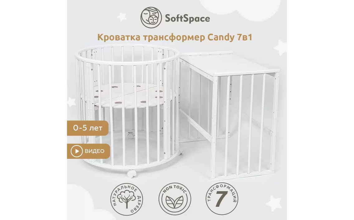 Кроватка-трансформер для новорожденного SoftSpace Candy 7в1 Береза цвет Белый 125x75 смСер. номер: 75125CD/W.