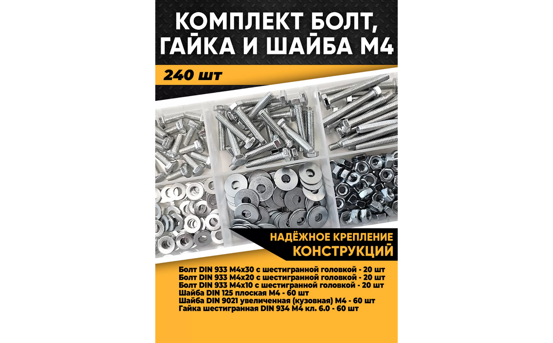 Комплект болт М4, гайка М4, шайба М4 - 240 шт. в органайзере, KraSimall 100260Сер. номер: 100260