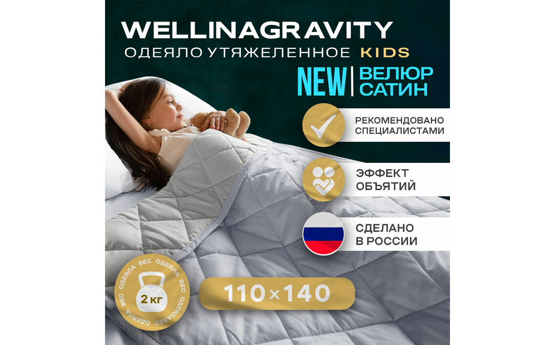 Утяжеленное детское одеяло Wellinagravity 110х140 WGS-11 серое велюр 2кгСер. номер: WGS-11-велюр, серый 2кг