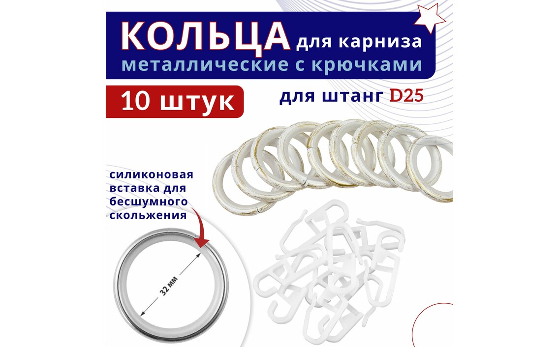 Кольца для штор металлические с крючками для карнизов D25 белый золото 10штСер. номер: ТК2124955