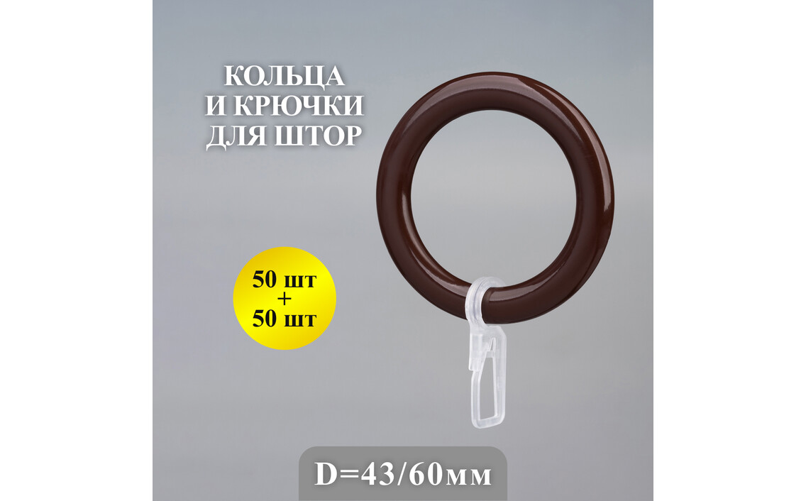 Кольца Gred для штор и карниза коричневые с крючками, 50 штСер. номер: КК-50-коричневый,прозрачный