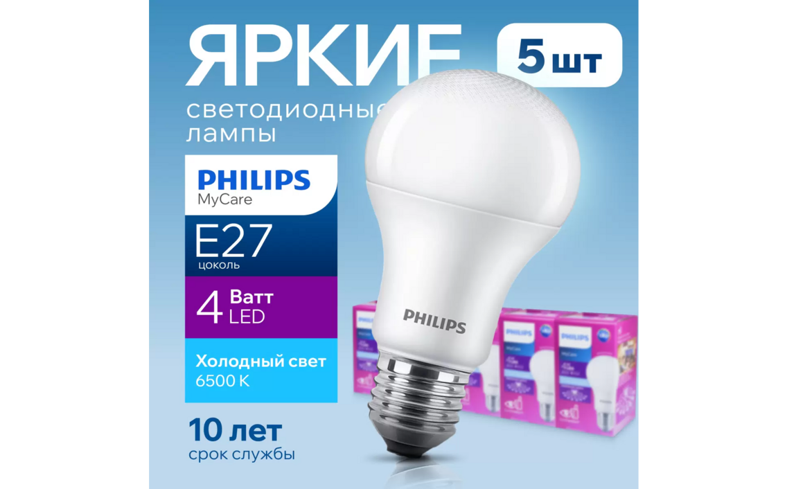 Лампочка светодиодная Philips Е27 4 Ватт груша 6500К матовая 420лм 5штСер. номер: 9290019147385-5