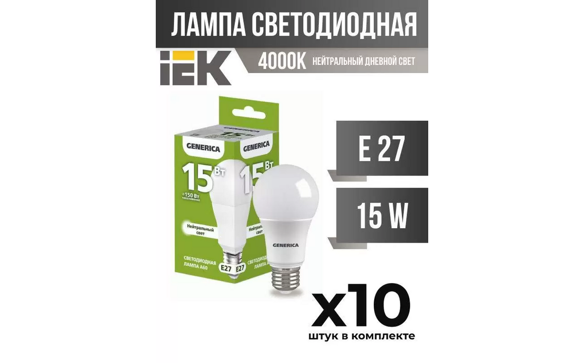 Лампа светодиодная IEK GENERICA E27 15W A60 4000K матовая, арт. 827966, 10 шт.Сер. номер: опт_424597_10