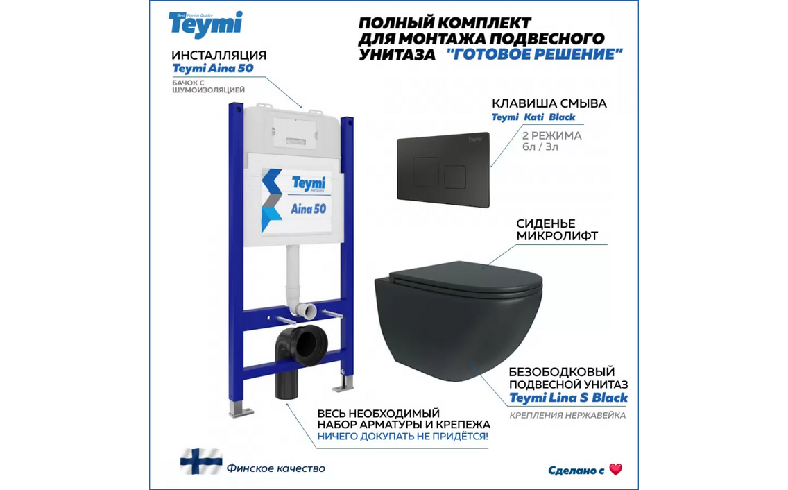 Унитаз с бачком скрытого монтажа комплект 6 в 1 Teymi кнопка гигиенический душ F12544Сер. номер: F12544