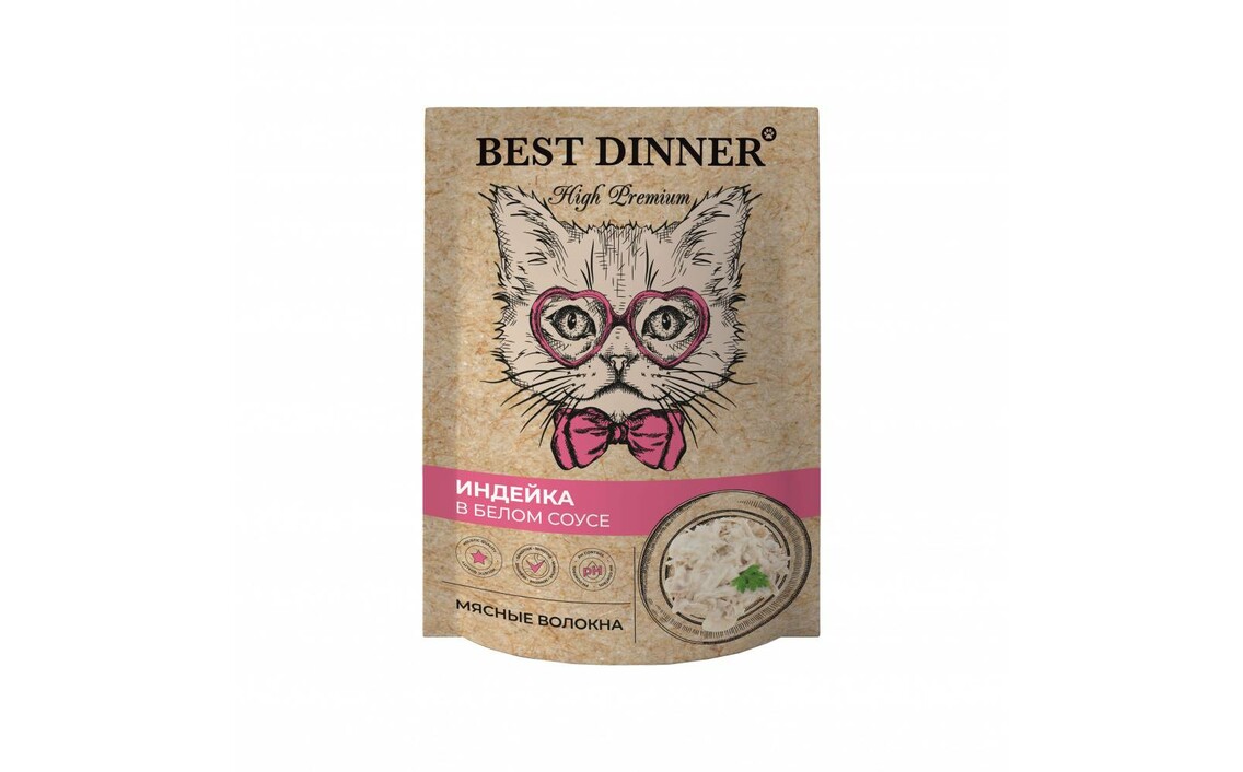 Корм для кошек Best Dinner High Premium Индейка в белом соусе волокна филе грудки пауч 85гСер. номер: 8211857151463497036