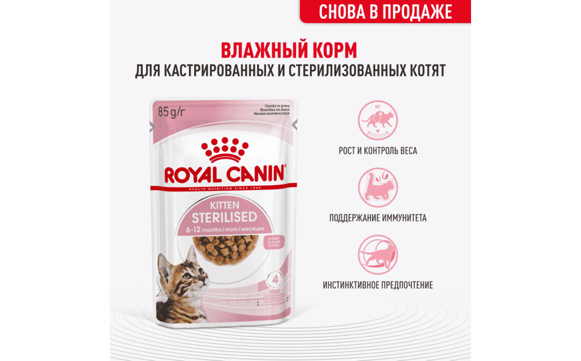 Корм для котят ROYAL CANIN Kitten Sterilised для стерилизованных от 6 мес., кусочки в соусе пауч 85гСер. номер: 2979612689382431620