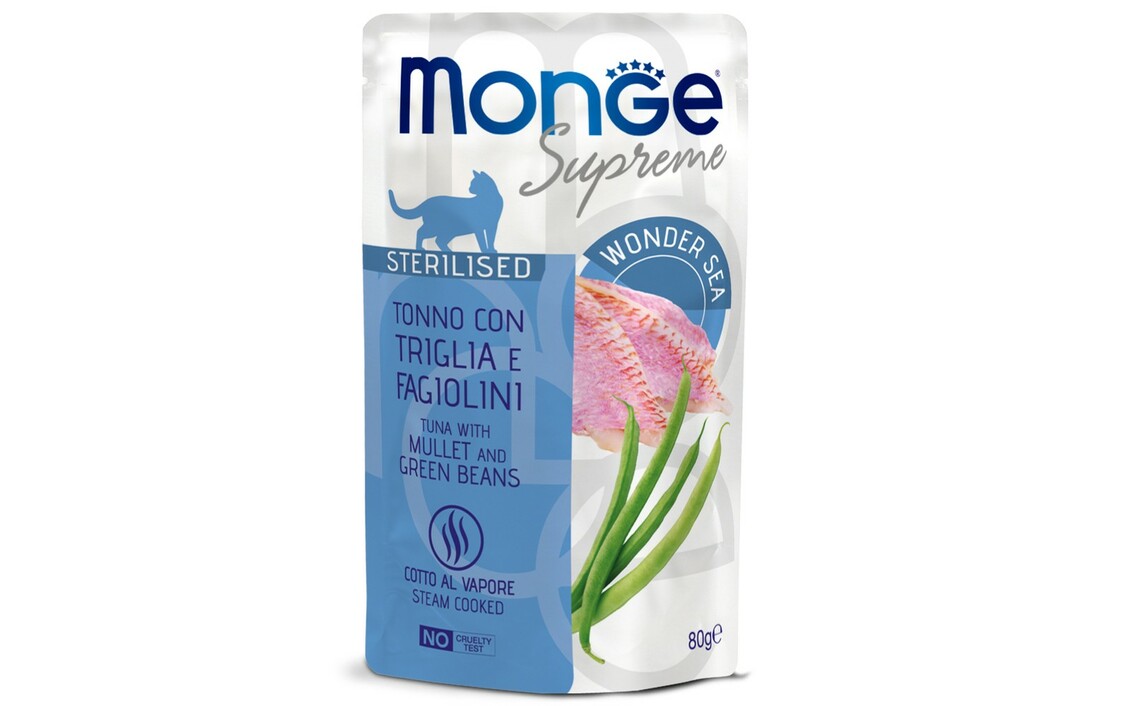 Корм для кошек Monge Supreme Pouch для стерилизованных, тунец с кефалью и зелёной фасолью пауч 80гСер. номер: 4656451351335484155