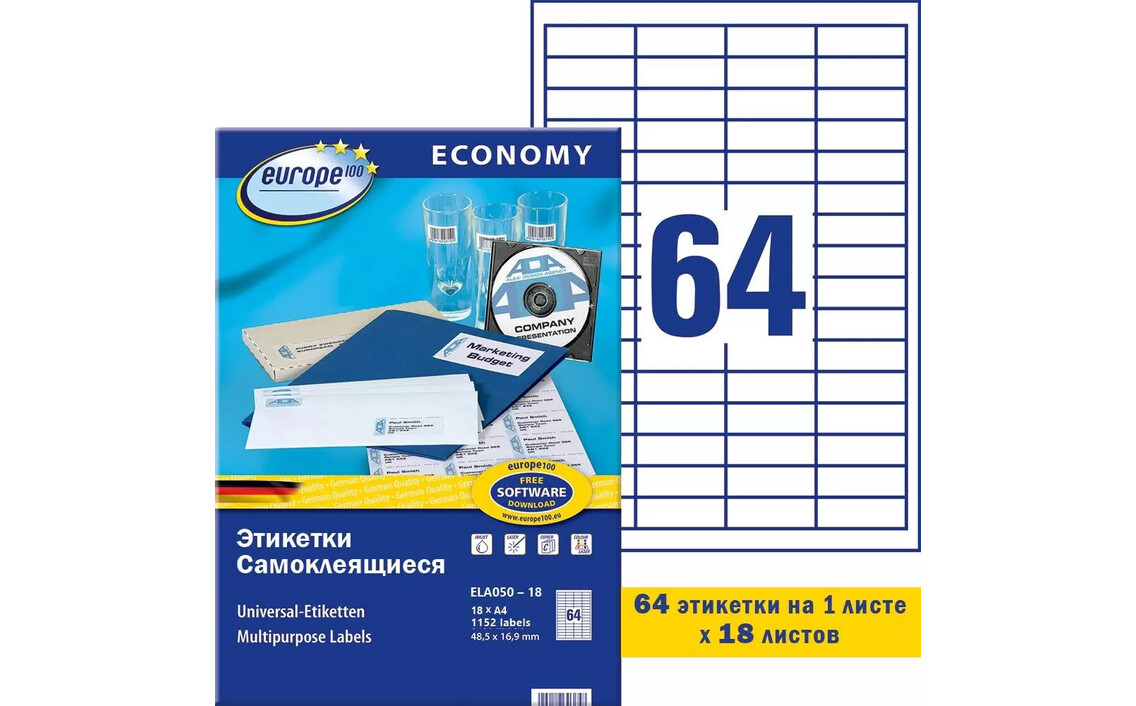 Самоклеящиеся этикетки Европа-100, 48,5х16,9 мм, 64 этикетки/лист, 18л., ELA050-18Сер. номер: ELA050-18